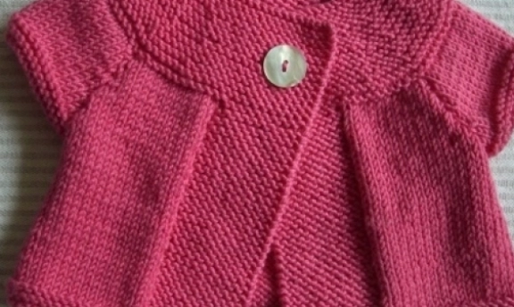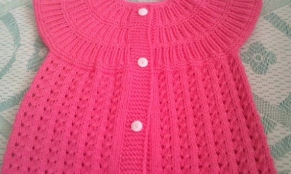 yakadan başlanan pembe örgü çocuk yeleği