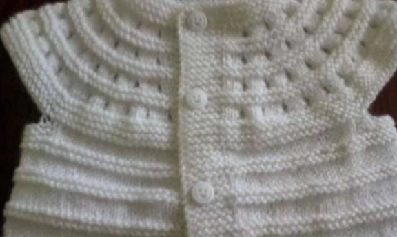 yakadan başlanılarak örülmüş motifli kız bebek yeleği
