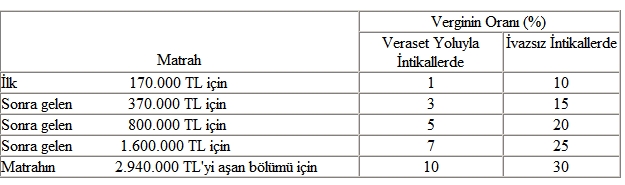 7338 sayılı Kanunun 16 ncı maddesinde yer alan vergi tarifesi matrah dilim tutarları yukarıda belirtilen yeniden değerleme oranında artırılmak suretiyle tespit edilmiştir. Bu nedenle, 1/1/2011 tarihinden itibaren veraset yoluyla veya ivazsız surette meydana gelen intikallerde veraset ve intikal vergisi aşağıdaki tarifeye göre hesaplanacaktır.