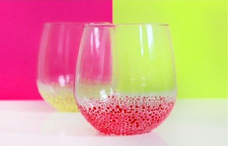 * Seçtiğiniz bardaklar için kullanacağınız renk ojeyi belirleyip plastik tabağa dökün ve pamuklu çubuk yardımıyla bardağınızın taban kısmına benekler koyun.