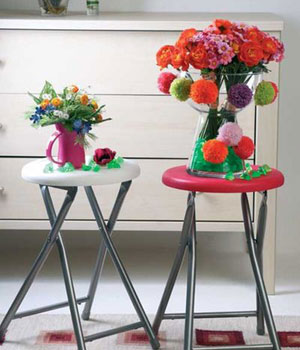 Cam veya düz renkte bir vazonun üzerine çift taraflı bantla yapıştıracağınız ponponların renkleriyle uyumlu bir grup çiçeği vazonuza yerleştirin. Sonra da karşısına geçip seyredin. Emeklerinize değmedi mi? Abajur, ponponları en iyi taşıyan objelerden.