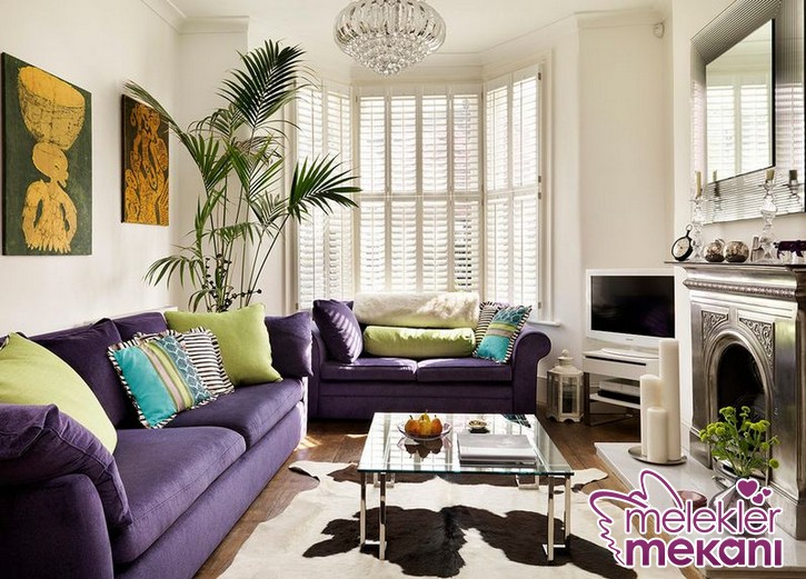 Duvar rengin de gri ve tonlarının yanısıra beyaz duvar rengide mor koltuklarınızı ön plana çıkartacak ve mor renginin sert duruşunu yumuşatacaktır.