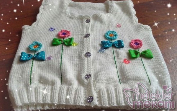 Örgü işi süslü kız bebek yelekleri