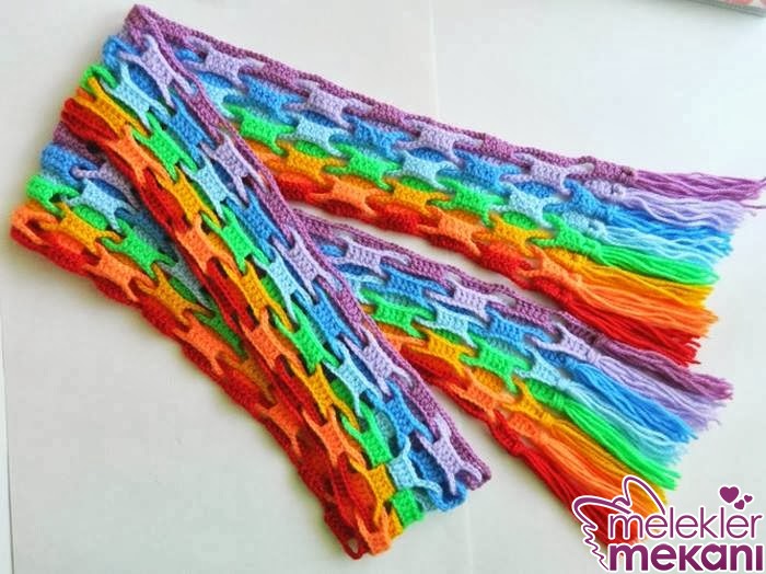 Benim gibi atkı kullanmayı seviyorsanız rengarenk atkı modelleri ilginizi çekecektir. İşte hoş saçakları olan bir atkı örneği daha. Buna uygun dediğim gibi beresidir eldivenidir örüp kombine şeklinde kullanabilirsiniz.