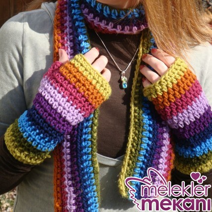 Aşağıda da eldivenleri ile uyumlu rengarenk bir atkı modeli duruyor. Bu arada parmaksız eldivenler de moda. Öreceğiniz atkılarınızla uyumlu parmaksız eldivenlerinizle kışın bile çok şık olabilirsiniz. Atkılar hemen örülebilen örgüler olduğu için bir günde birkaç tane sevdiğiniz modeli örebilirsiniz.